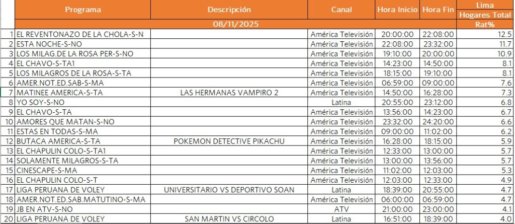 El ‘Reventonazo’ tuvo 12.5 puntos de rating con un programa donde estuvieron como invitados Yiddá Eslava, Dina Páucar, el elenco de Luz de Luna y los exintegrantes de Son del Duke. Luego, el espacio ‘Esta Noche’ contó con la presencia de ‘Corazón Serrano’ y Dilbert Aguilar y registró 11.7 puntos. Esto superó a la competencia, pues ‘Yo soy’ tuvo 6.8 puntos y ‘JB en ATV’ apenas 4.1 puntos.
