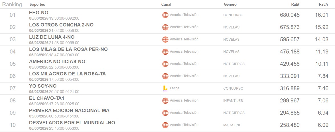 El reality que es producido por Pro Tv, y se emite en América Televisión alcanzó los 16 puntos de rating, siendo número uno y superando ampliamente a la competencia. Luego, le siguiendo ‘Los otros Concha 2’ con 15.9; ‘Luz de luna 4’ alcanzó 14 puntos y ‘Yo soy’ tuvo 7.4 puntos.