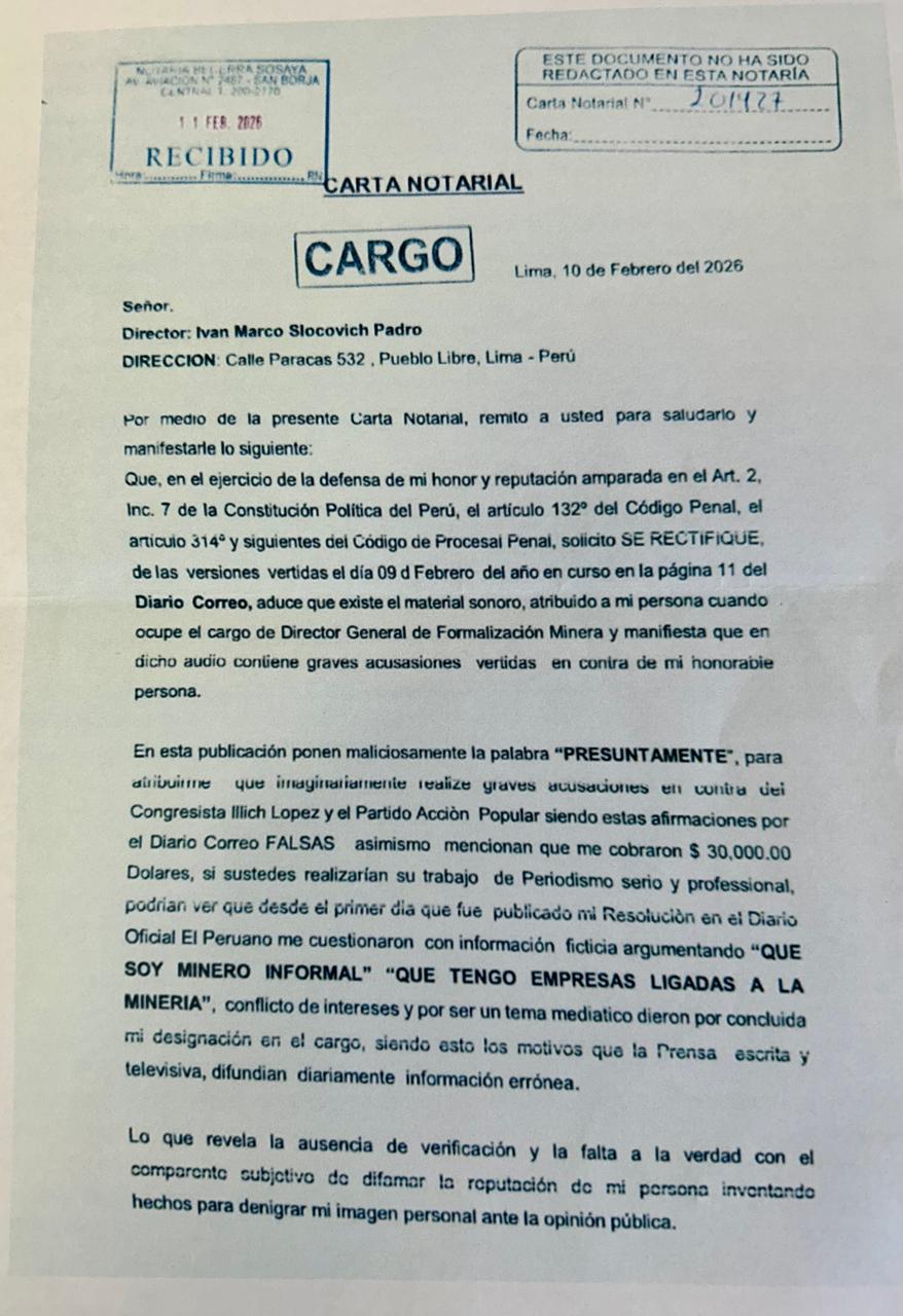A través de una carta notarial, Portilla Barrera sostiene que las afirmaciones que lo vinculan con pagos irregulares son falsas y difamatorias, y solicita que se rectifiquen en un plazo máximo de 48 horas. En el documento, dirigido Iván Slocovich, advierte que se le atribuyen hechos y conductas que nunca ocurrieron, lo que constituye un intento de dañar su imagen personal y profesional.