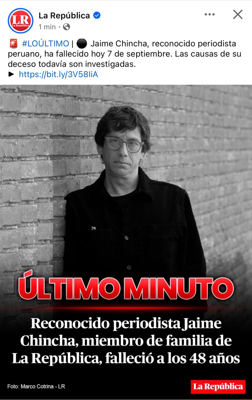 El periodista Jaime Chincha con amplia trayectoria y reconocido por su apuesta por los valores democráticos, falleció hoy, domingo 7 de septiembre, a los 48 años. Los motivos de su deceso todavía siguen siendo materia de investigación.falleció este domingo 7 de septiembre a los 48 años. Los motivos de su muerte todavía siguen siendo materia de investigación, según informó el diario La República.