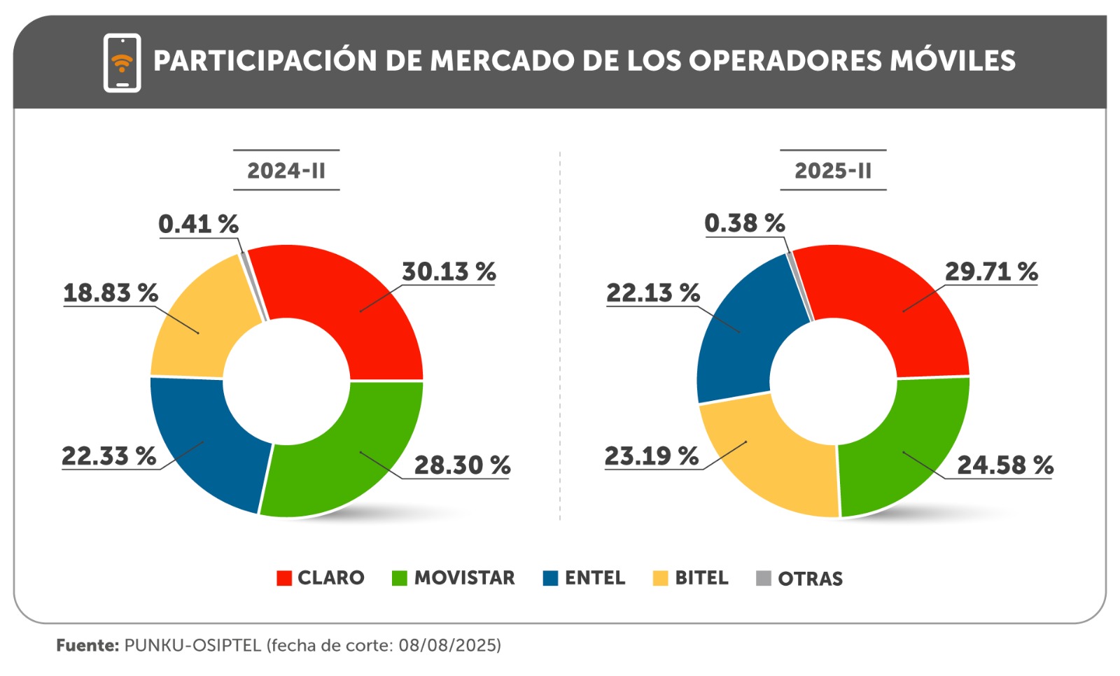 El mayor crecimiento correspondió a Bitel, que pasó de tener el 18.83 % de la participación, en junio de 2024, al 23.19 % (10.14 millones de líneas móviles), en junio de este año. De esta manera, Bitel desplazó de la tercera posición a nivel de participación de mercado, por primera vez, a Entel, que registra el 22.13 % de participación (9.67 millones).