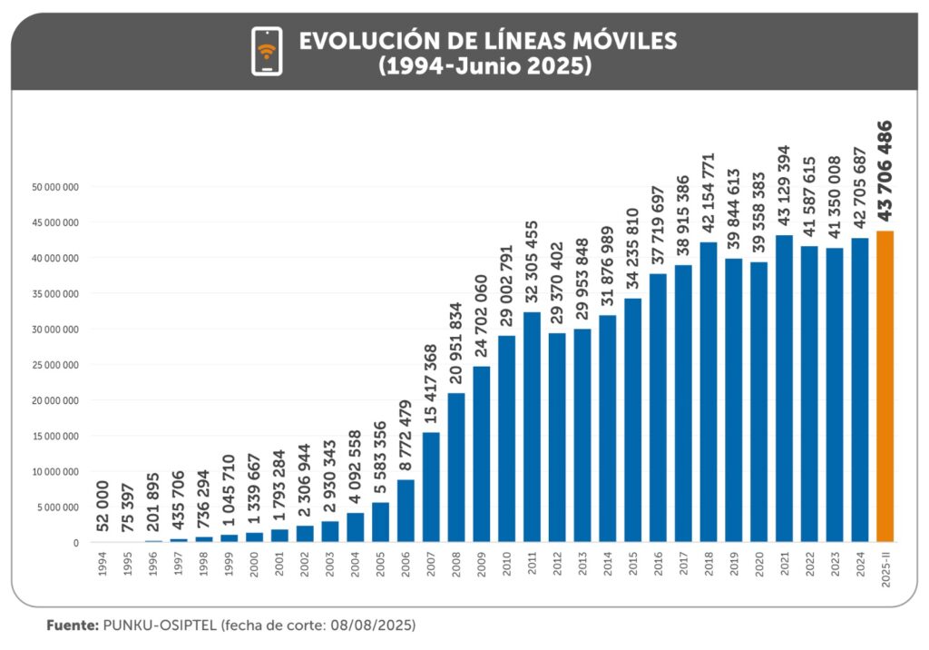 La competencia de las empresas operadoras y crecimiento de la demanda, dentro de un marco regulatorio inteligente, han permitido que el mercado móvil en Perú continúe expandiéndose y, al cierre del primer semestre de 2025, alcanzó la cifra histórica de 43.7 millones de líneas móviles activas, lo que representó un incremento de alrededor de un millón de líneas respecto al total registrado en diciembre de 2024 (42.7 millones), informó el Organismo Supervisor de Inversión Privada en Telecomunicaciones (OSIPTEL).