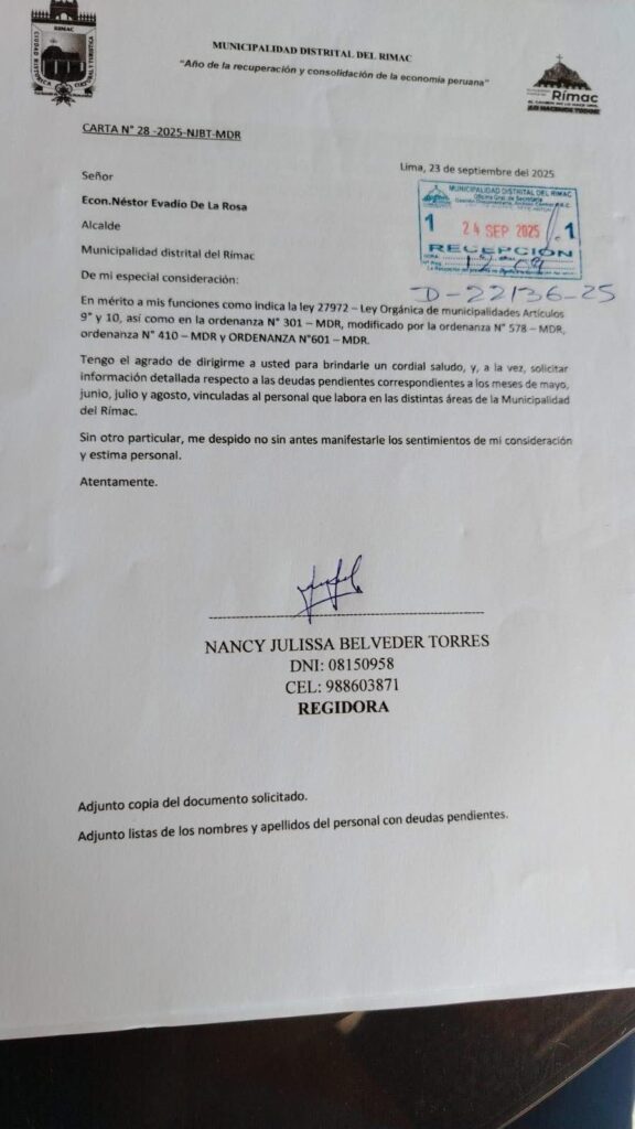 Por su parte la regidora Nancy Julissa Belveder Torres, mediante la carta N°28 – 2025 NJBT- MDR , enviada al propio alcalde del Rímac el 24 de septiembre de 2025, solicita se regularice con los pagos a los trabajadores municipales adeudados desde mayo, junio, julio y agosto , sin obtener respuesta alguna a la demanda.