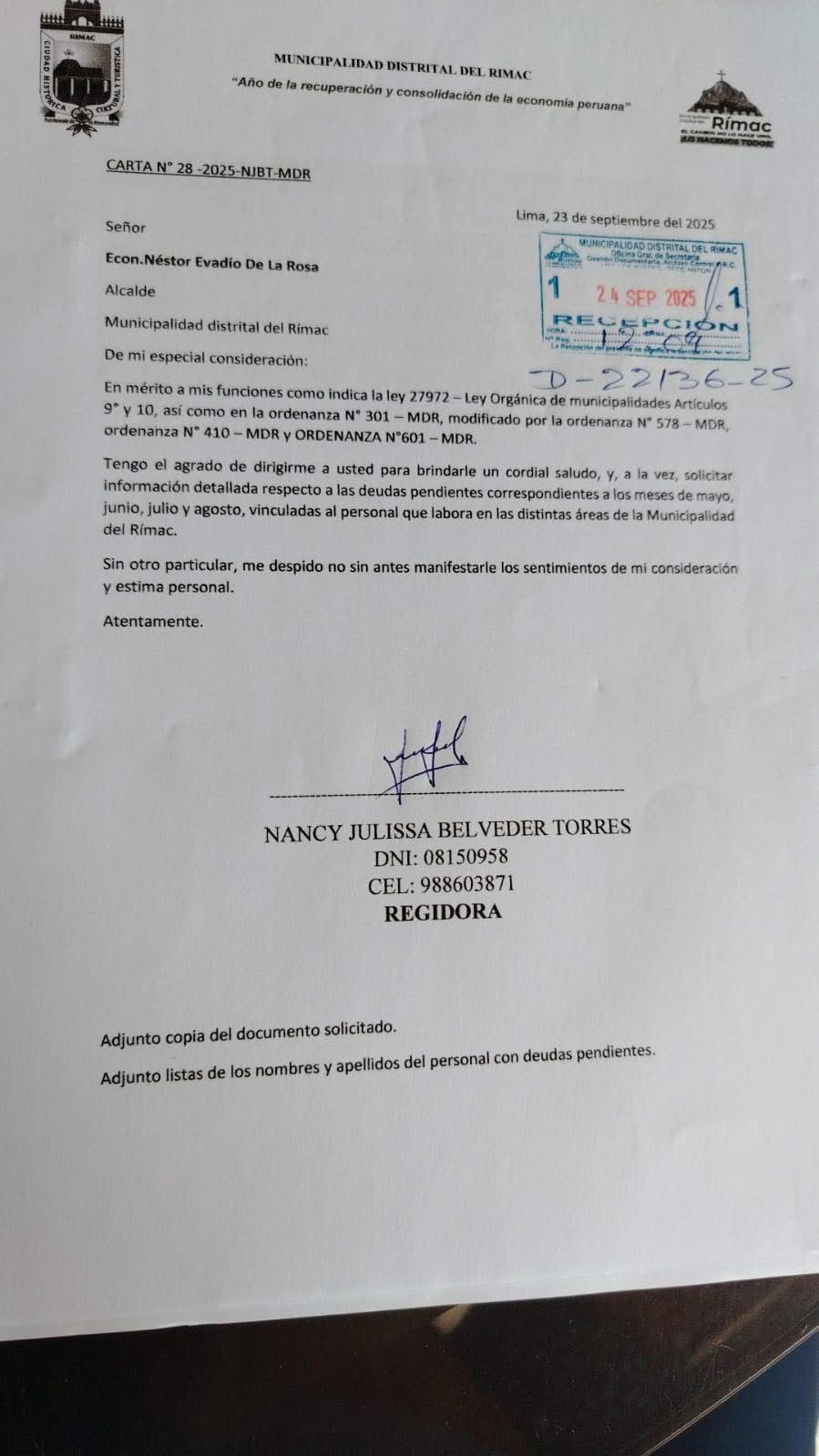 Por su parte la regidora Nancy Julissa Belveder Torres, mediante la carta N°28 – 2025 NJBT- MDR , enviada al propio alcalde del Rímac el 24 de septiembre de 2025, solicita se regularice con los pagos a los trabajadores municipales adeudados desde mayo, junio, julio y agosto , sin obtener respuesta alguna a la demanda.