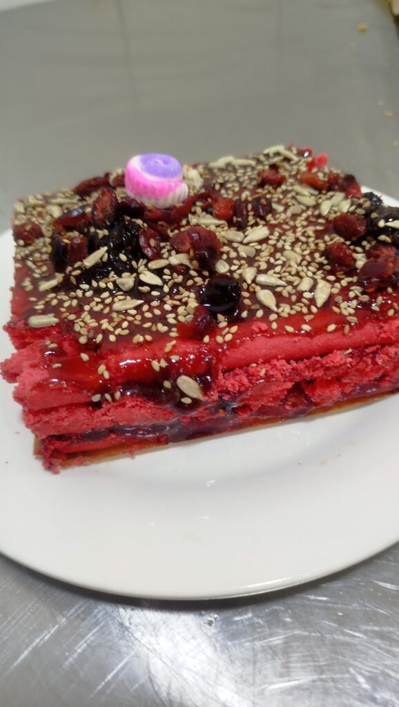 • Turrón Red Velvet: Turrón innovador saliéndonos un poco del contexto de lo tradicional para experimentar nuevos sabores entre lo dulce y lo cítrico hecho a base de Harina de trigo, mix red velvet, beterraga, chocolate blanco, miel de frutas del bosque (arándanos rojos , arándanos azul ,fresas , frambuesa y zarzamora).