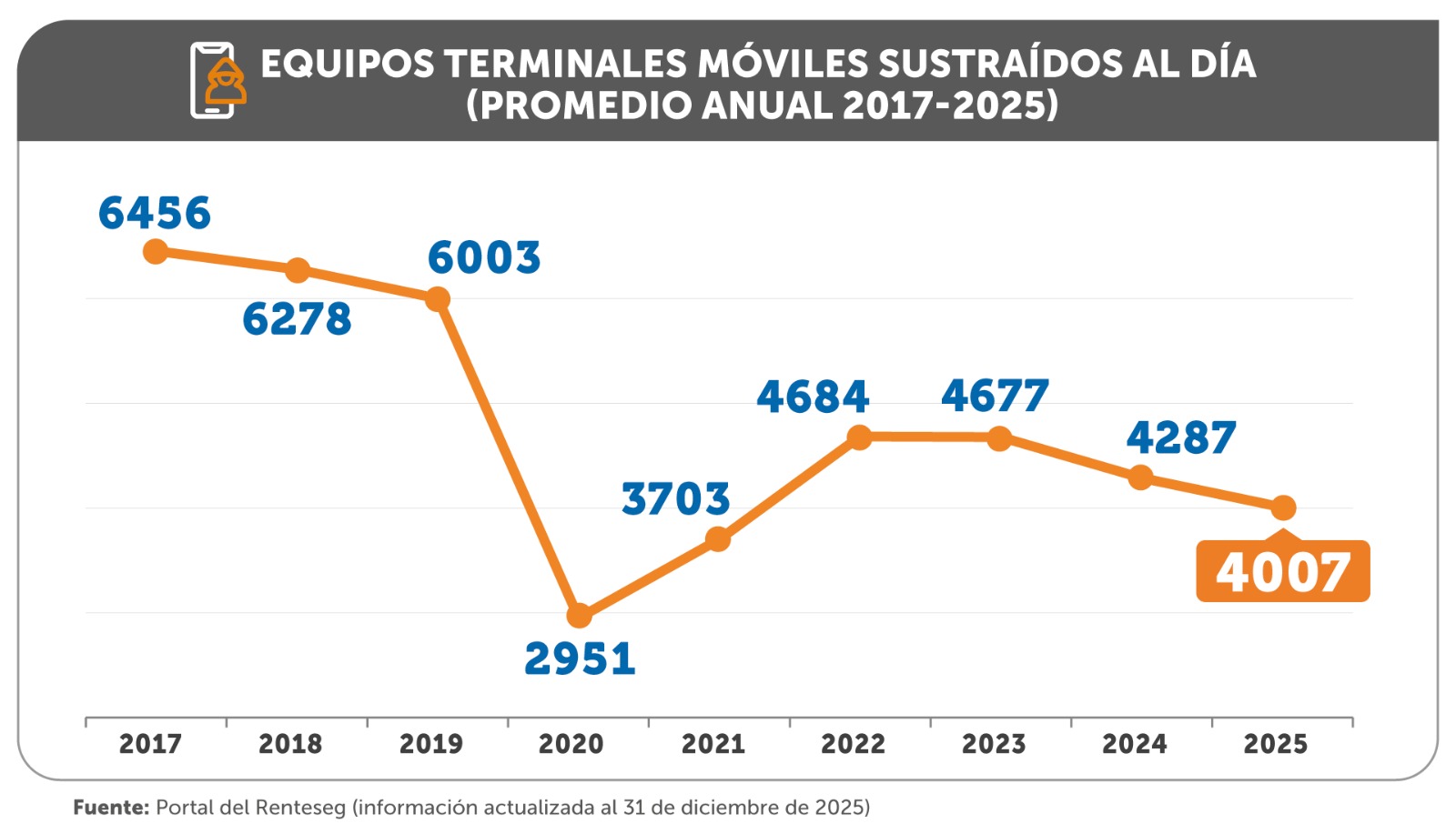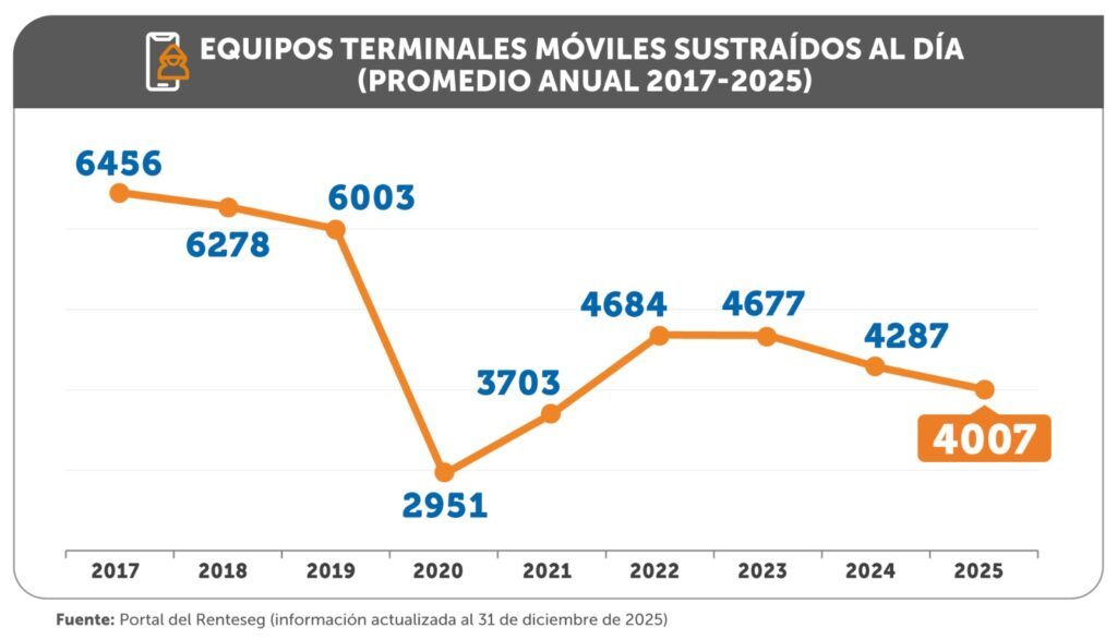 Este resultado forma parte de una tendencia sostenida. En los últimos nueve años, el reporte por robo de celulares disminuyó en 38 %, pasando de un promedio de 6456 equipos robados por día a 4007 al cierre de 2025.